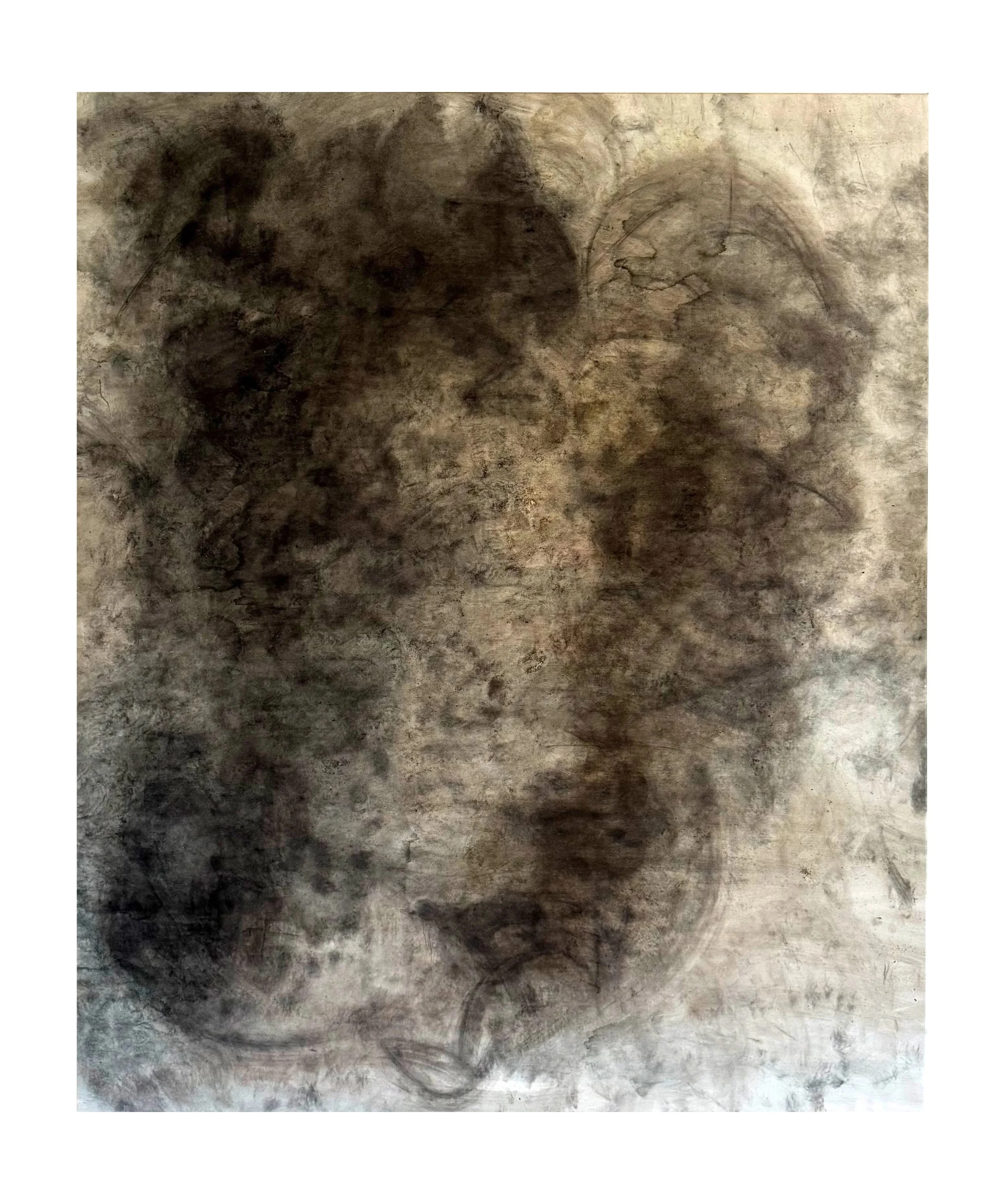 Asche, Kohle, Pigmente, Acrylschlacke und Pastellkreide auf Leinwand